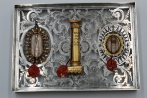 Le reliquaire en bois sculpté et doré encadre une plaque en argent ajouré qui contient trois reliques de la Passion enserrées chacune dans un bijou : un fragment de la Colonne de la flagellation (au centre), un fragment de la Vraie Croix (à gauche) ainsi qu’un fragment de la Tunique du Christ (à droite). Ces bijoux sont caractéristiques des XVIe et XVIIe siècles.